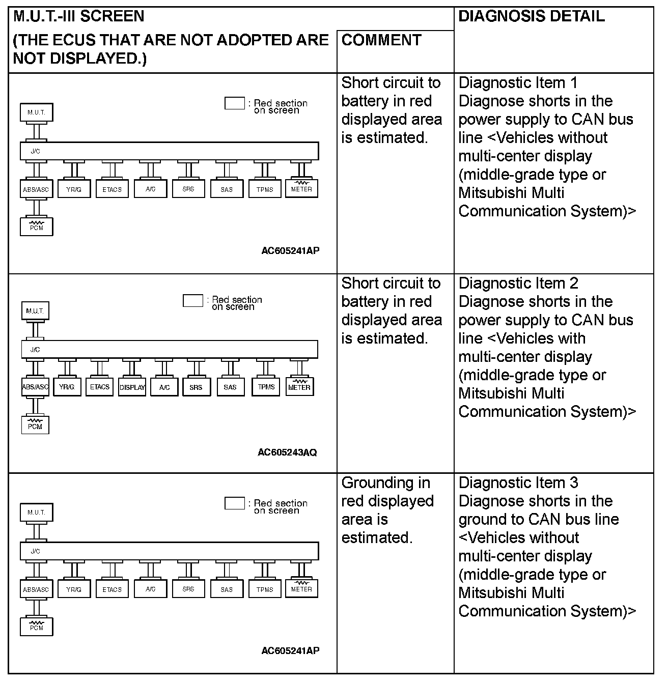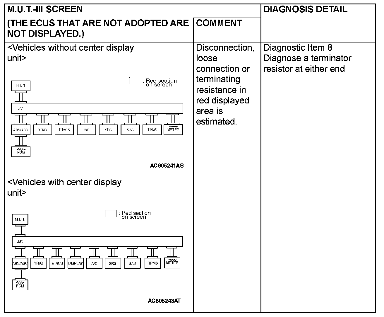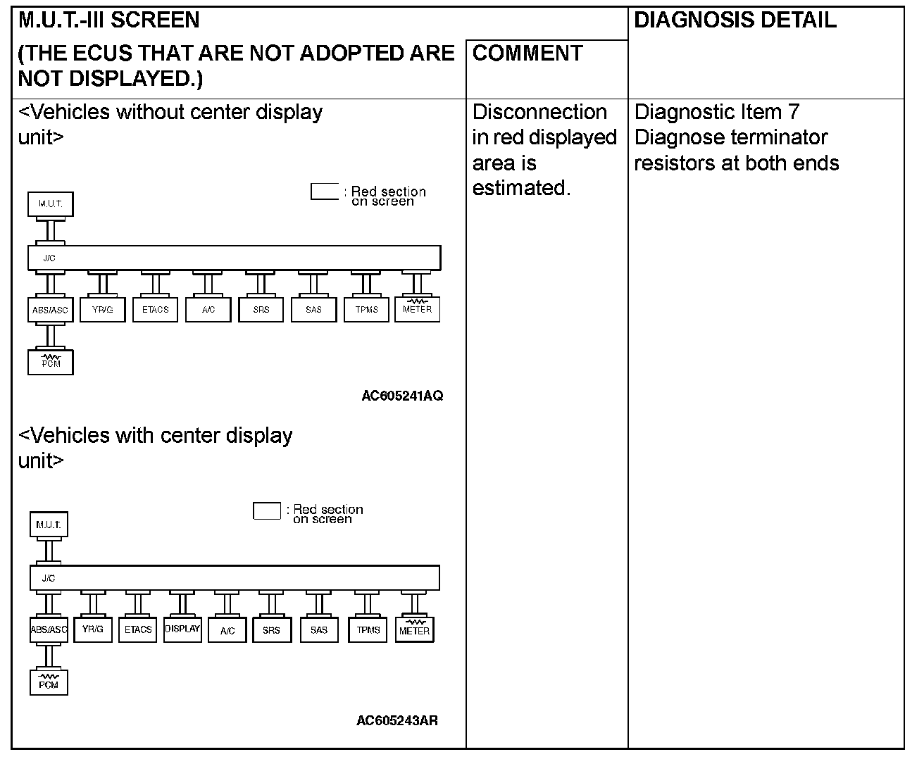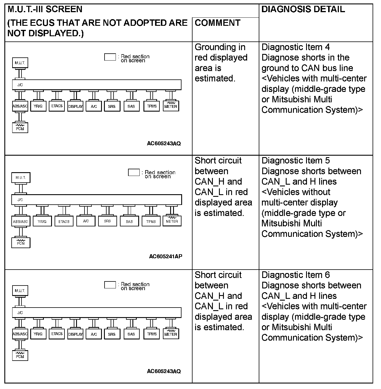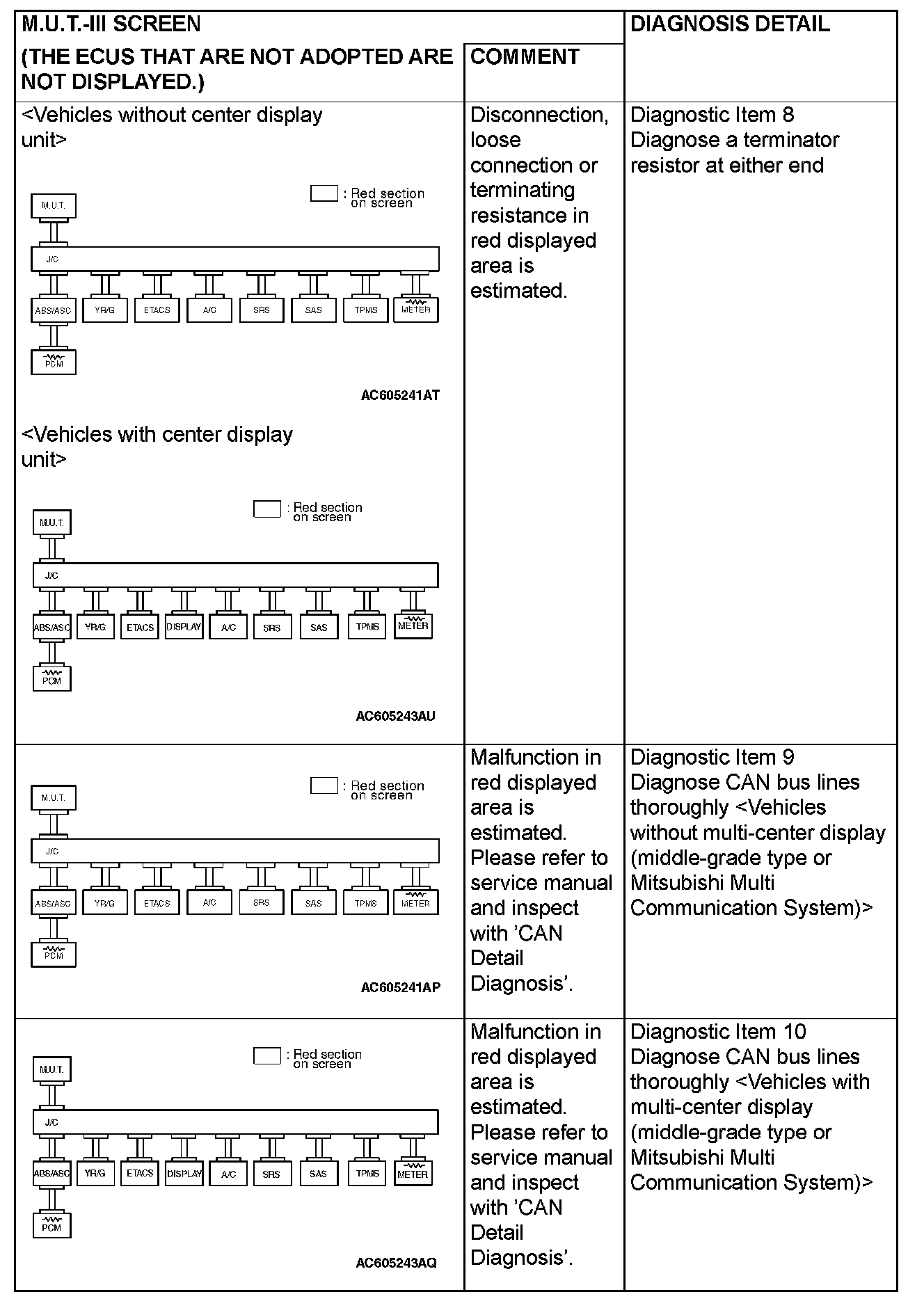 - If the screen other than above is displayed, troubles are present at two or more spots. In this case, diagnose CAN bus lines by referring to the trouble spot pinpoint procedures.
