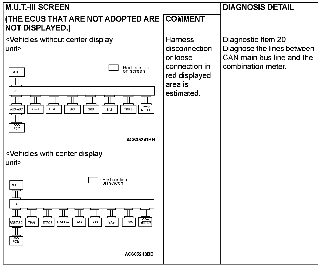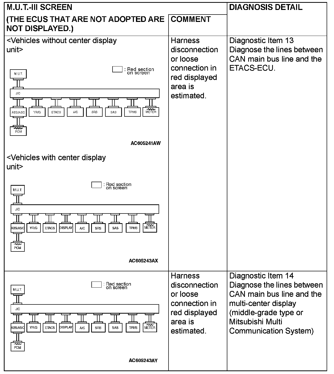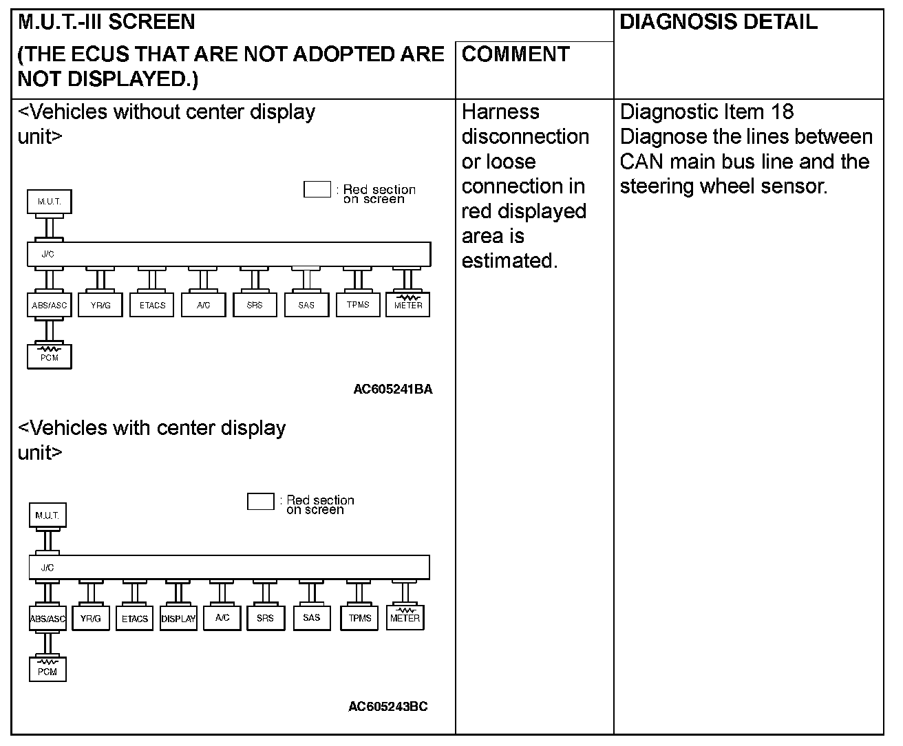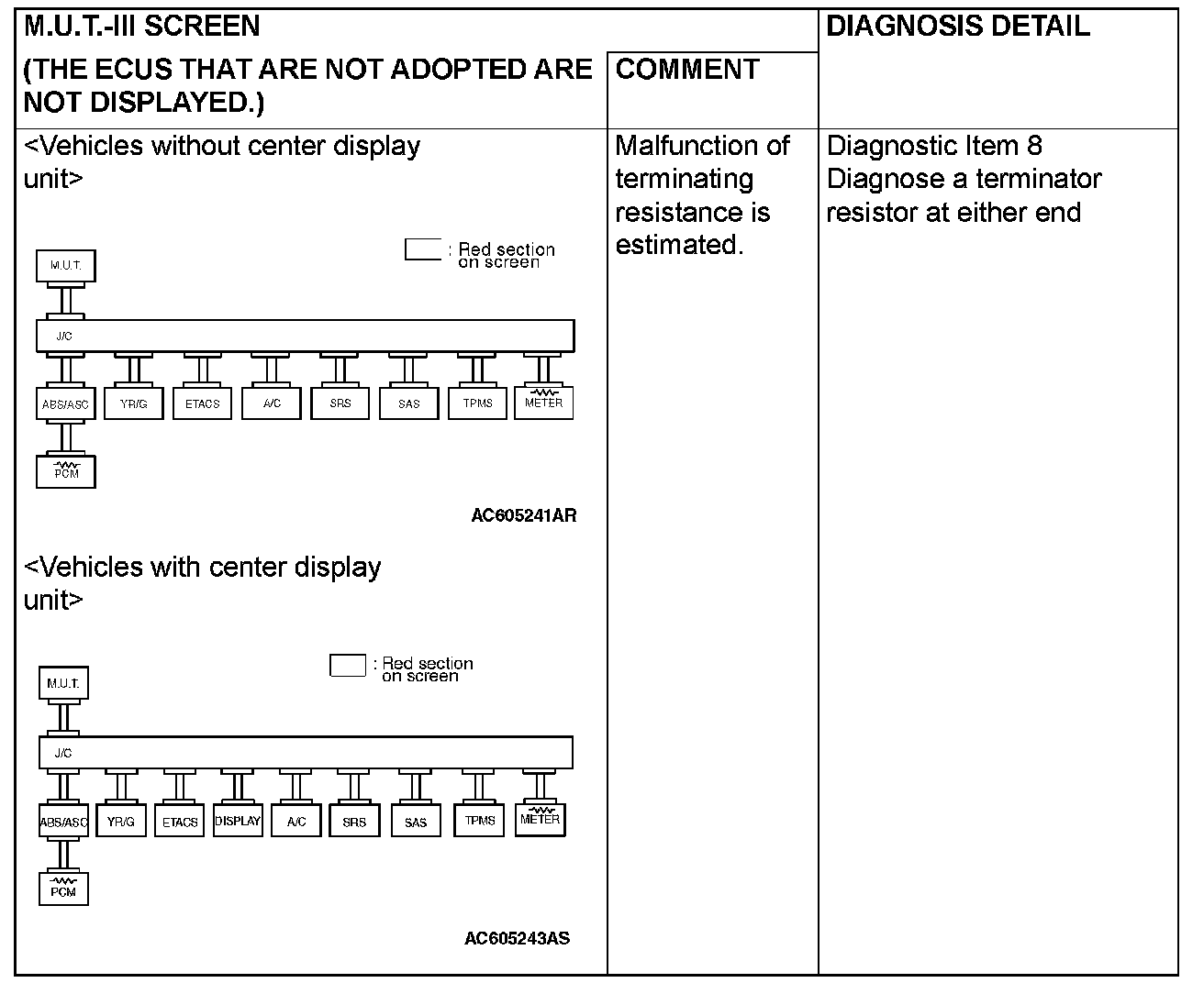 - If the screen other than above is displayed, troubles are present at two or more spots. In this case, diagnose CAN bus lines by referring to the trouble spot pinpoint procedures.