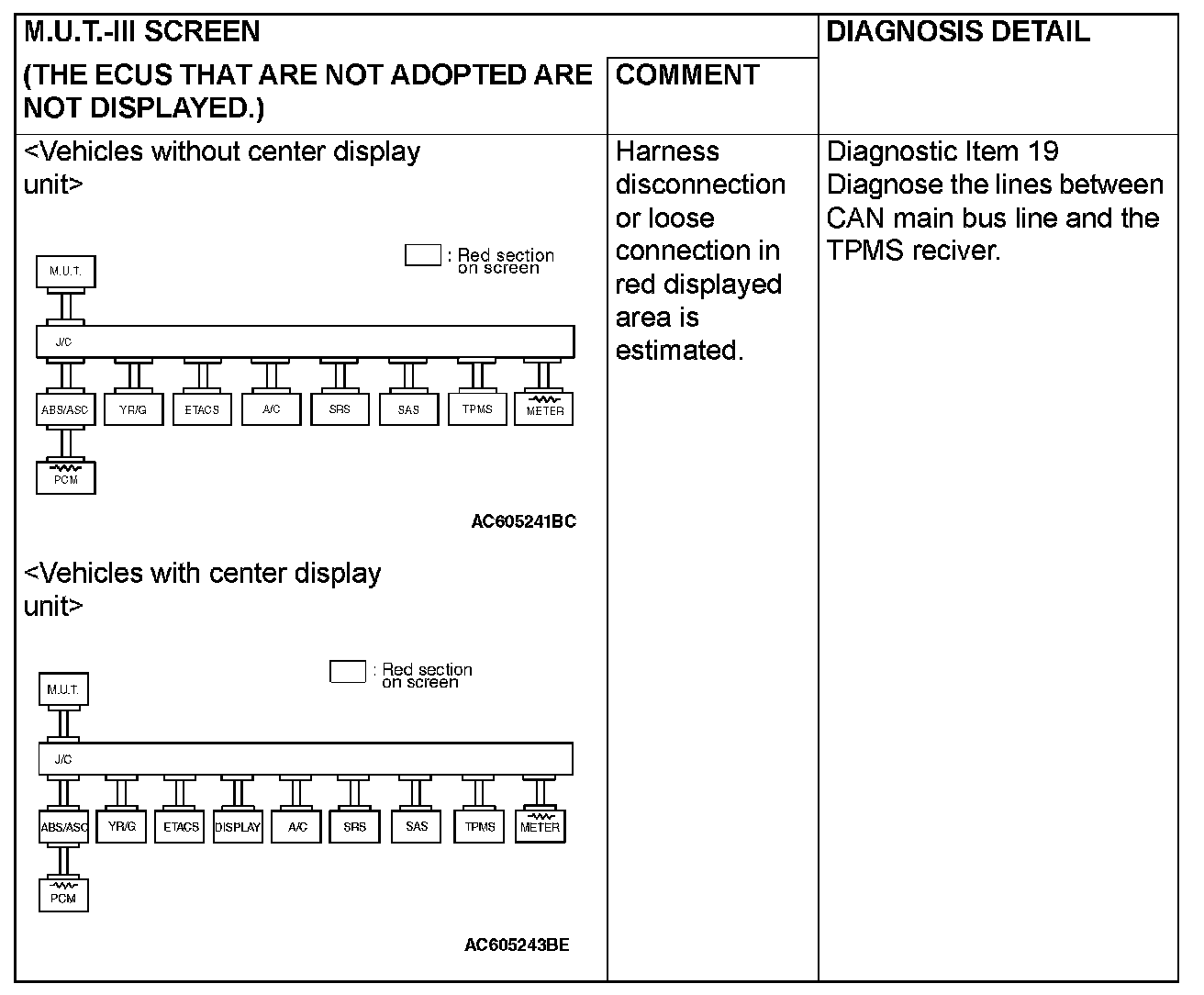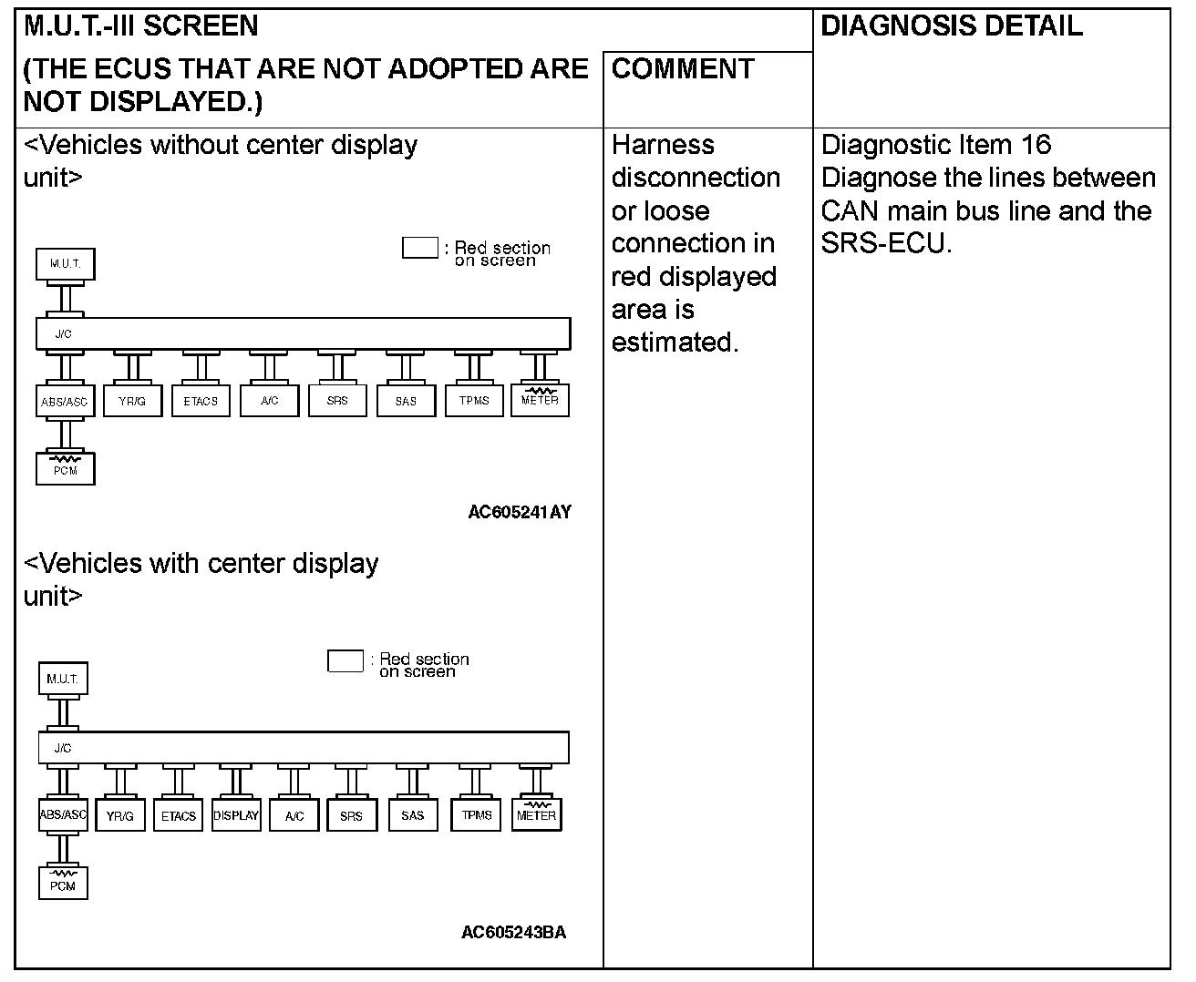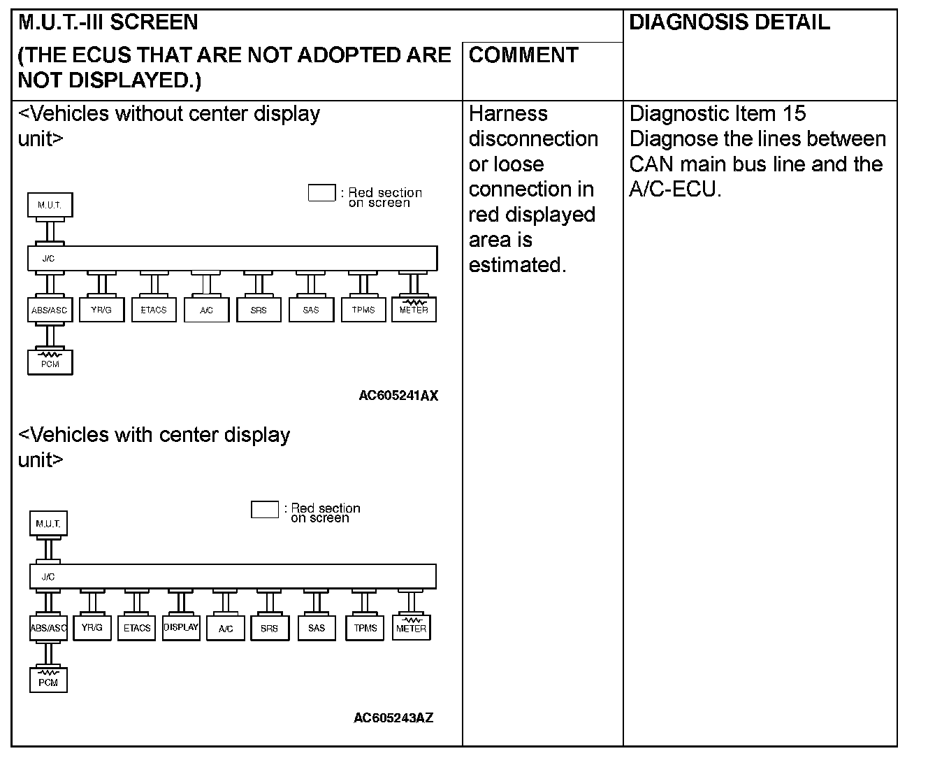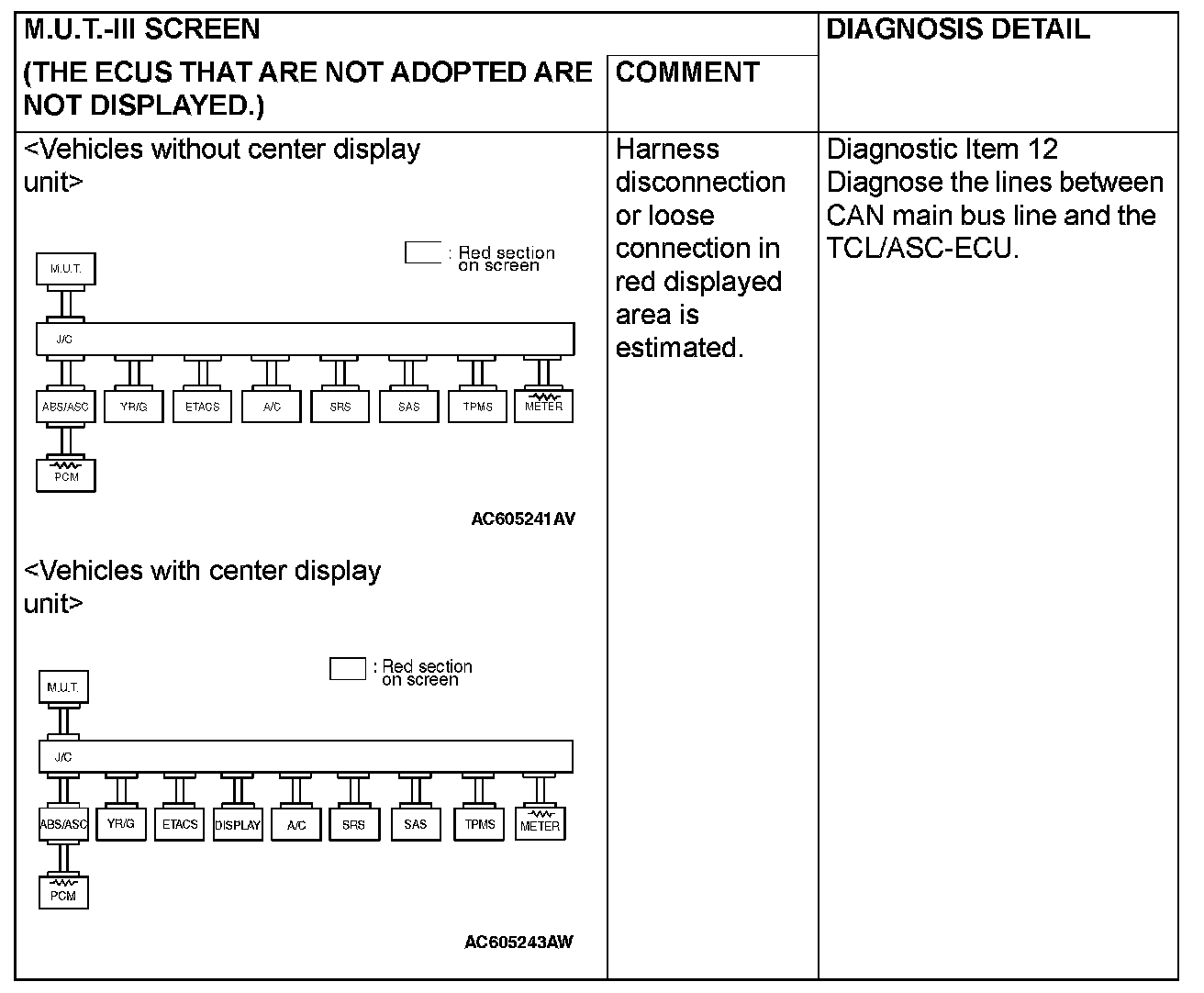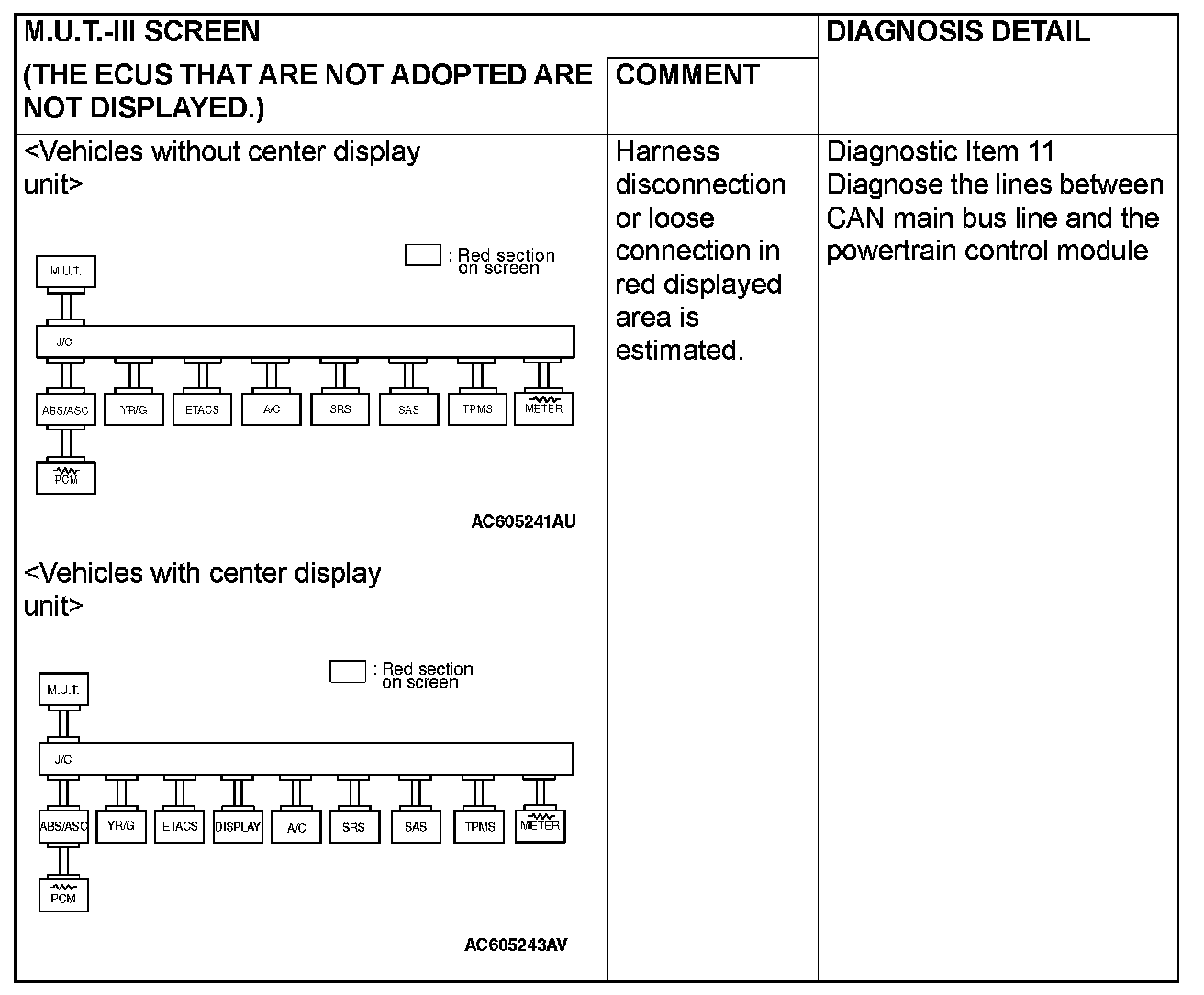 - If the screen other than above is displayed, troubles are present at two or more spots. In this case, diagnose CAN bus lines by referring to the trouble spot pinpoint procedures.