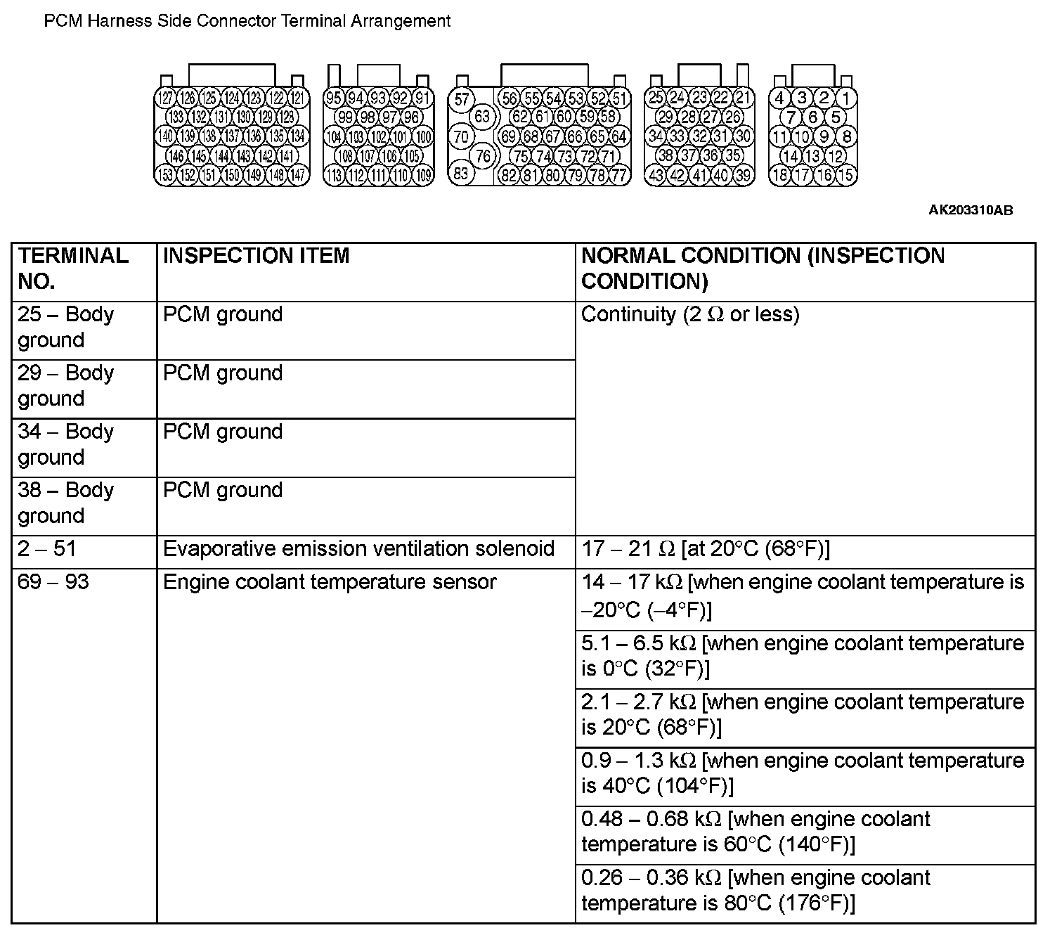 PCM Harness Side Connector Terminal Arrangement (Part 2):