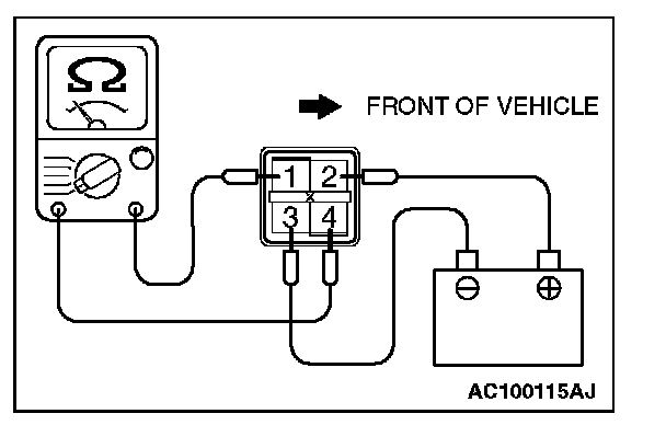 Check for continuity between A/T control relay terminals 1 and 4 when the jumper wires are connected to and disconnected from the battery.