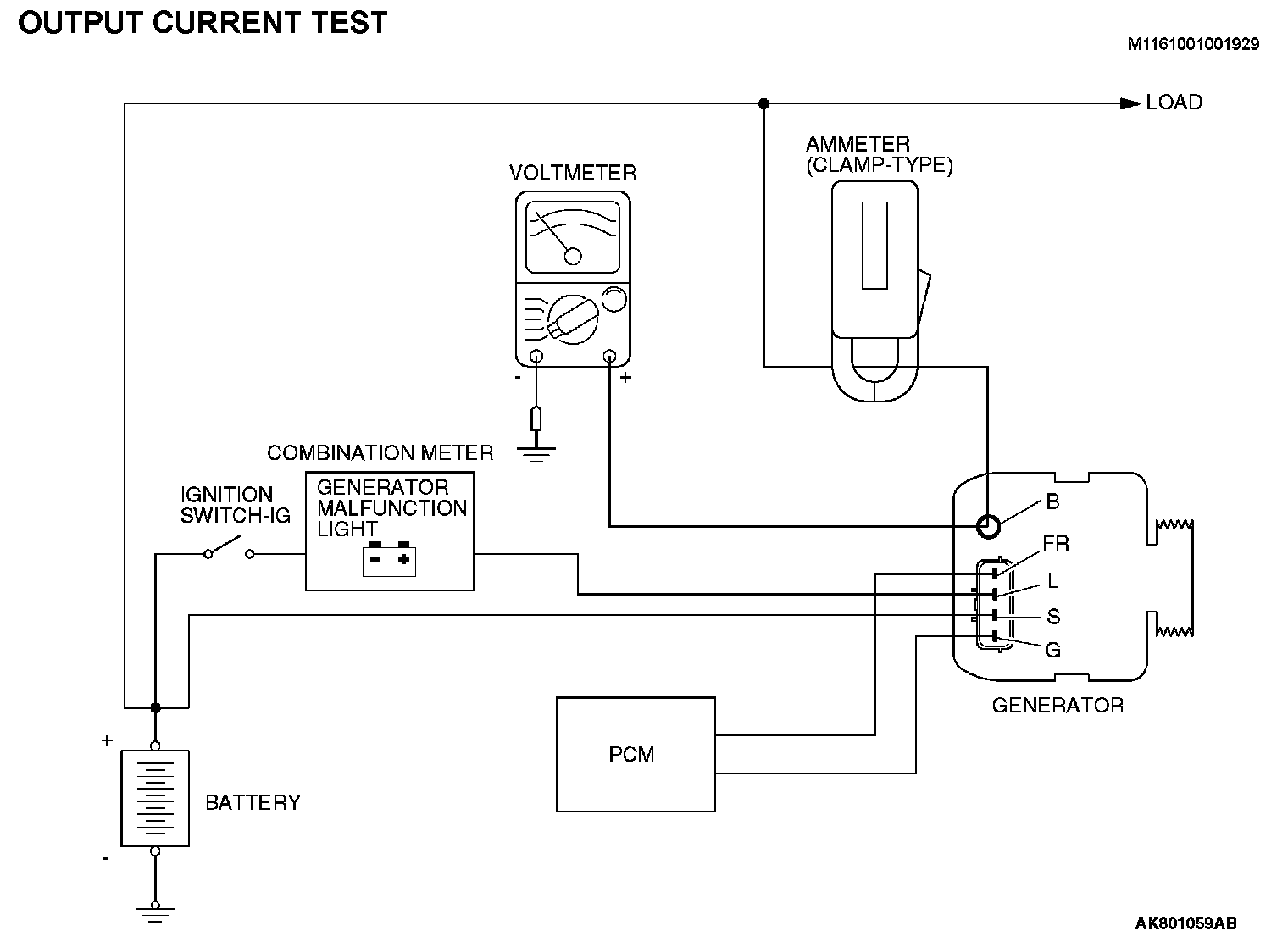 - If the electrical load is small while testing, the specified level of current may not be output even though the generator is normal. In such cases, increase the electrical load by leaving the headlights turned on for some time to discharge the battery or by using the lighting system in another vehicle, and then test again.