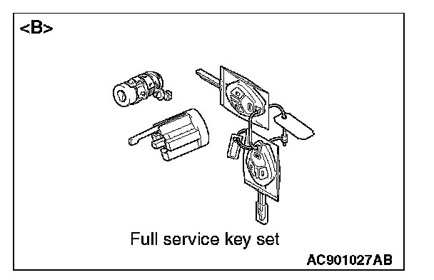 - Do not register the ignition keys other than the ignition key that starts the engine. (When replacing by the door service key set of illustration [A], the engine cannot start if the encrypted code is registered with the barcode on the ignition key supplied simultaneously. If the ignition key using for each lock cylinder and starting engine is used as a common ignition key, replace by the full service key set of illustration [B].)