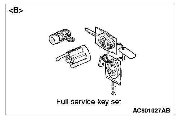 - Do not register the ignition keys other than the ignition key that starts the engine. (When replacing by the door service key set of illustration [A], the engine cannot start if the encrypted code is registered with the bar code on the ignition key supplied simultaneously. If the ignition key using for each lock cylinder and starting engine is used as a common ignition key, replace by the full service key set of illustration [B].)