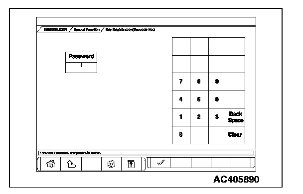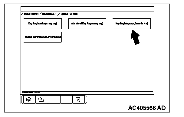ENCRYPTED CODE REGISTRATION USING BARCODE NO.When the ignition key that starts the engine is replaced due to the replacement of the ignition key set, the ignition key cylinder, etc., the barcode No. must be used to register encrypted codes.