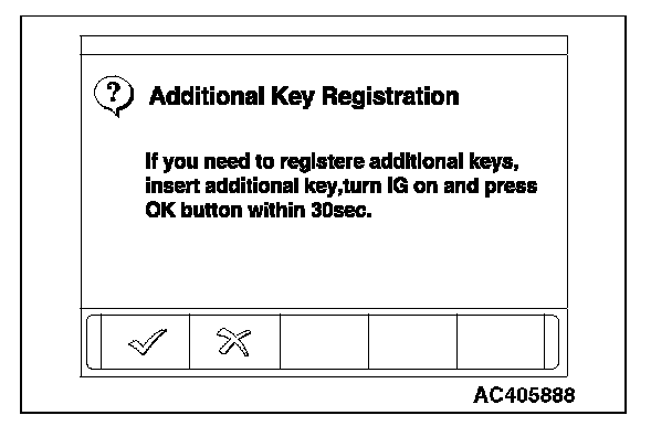 9. When the ignition key registration is finished, the additional key registration menu is displayed. To register the additional key, insert the key and turn the ignition switch to the "ON" position. Then, press the OK button. Press the CANCEL button to terminate the ignition key registration.
