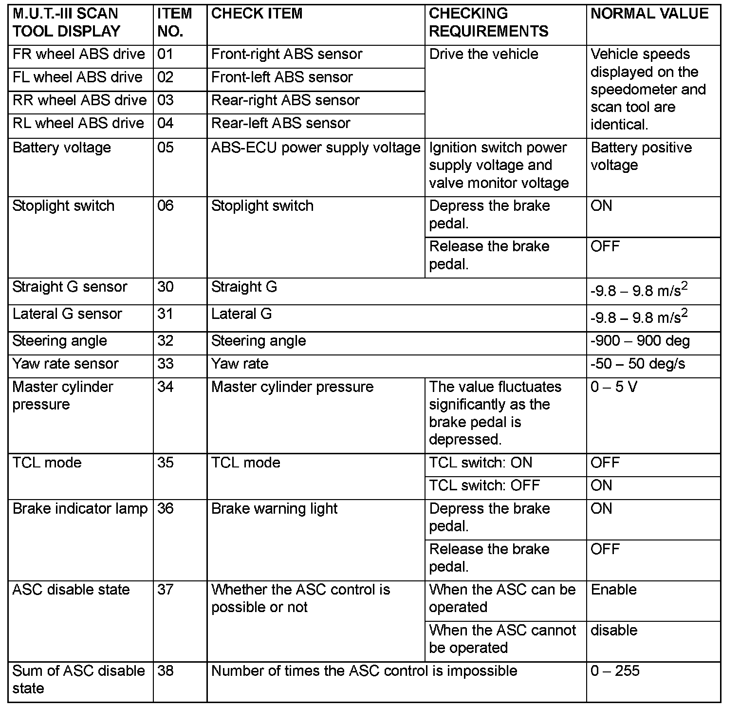 The following items can be read by the scan tool from the TCL/ASC-ECU input data.