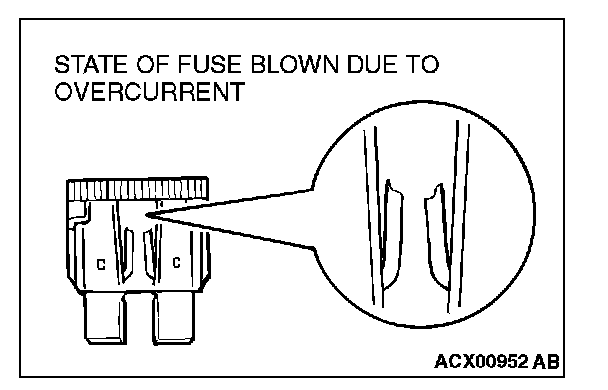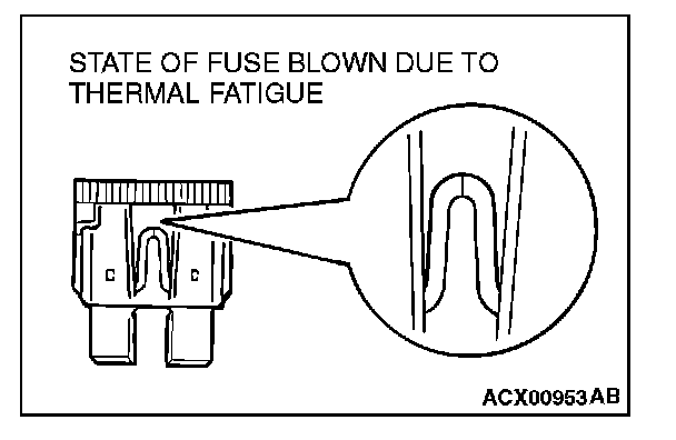 CAUTIONS IN EVENT OF BLOWN FUSEWhen a fuse is blown, there are two probable causes. One is that it is blown due to flow of current exceeding its rating. The other is that it is blown due to repeated on/off current flowing through it. Which of the two causes is responsible can be easily determined by visual check as described below.