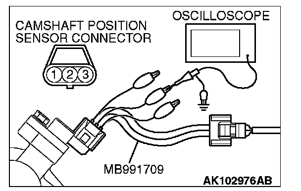 1. Disconnect the camshaft position sensor connector, and connect the test harness special tool (MB991709) between the separated connector (All terminals should be connected).