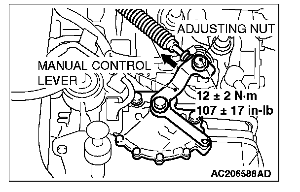 6. Gently push the transaxle control cable in the direction of the arrow, until the cable is taut. Tighten the adjusting nut.