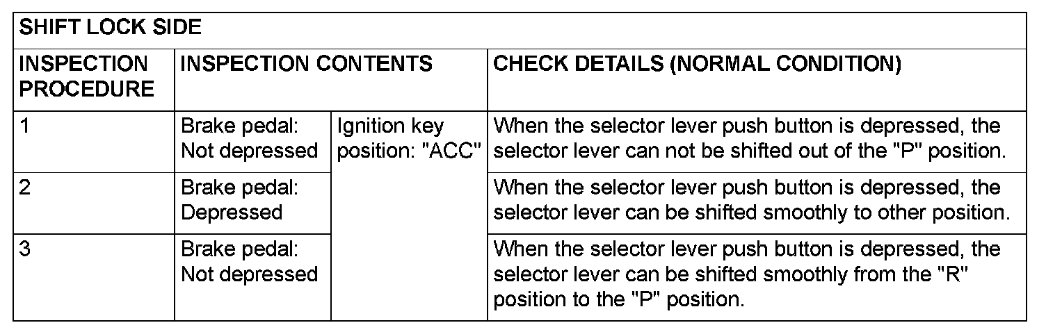 KEY INTERLOCK AND SHIFT LOCK MECHANISM CHECK1. Carry out the following inspection.