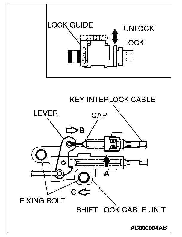 4) Loosen the bolt fixing the shift lock cable unit, push the lever in direction B and the unit in direction C and tighten the bolt at the standard torque.