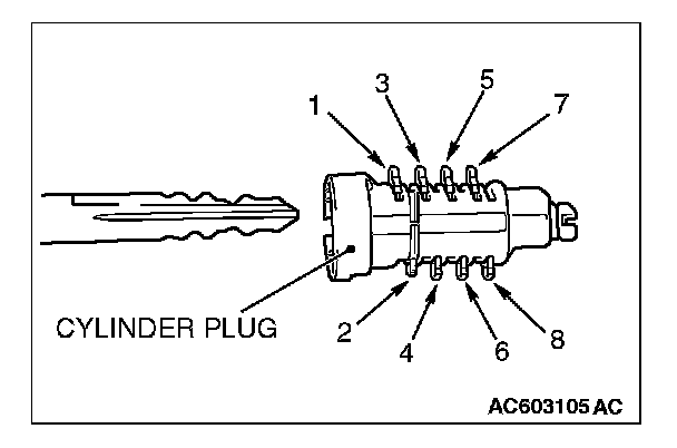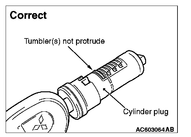 4. When the tumbler is not protruding, the correct tumbler is selected. Otherwise, the wrong tumbler is selected. If the wrong tumbler has been selected, remove the tumbler No. 1, and set the tumbler in the order from No. 2 to 4. Then, check the key insertion state and select the tumbler which does not protrude from the cylinder plug.