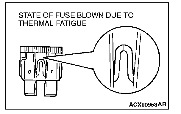 When a fuse is blown, there are two probable causes. One is that it is blown due to flow of current exceeding its rating. The other is that it is blown due to repeated on/off current flowing through it. Which of the two causes is responsible can be easily determined by visual check as described below.