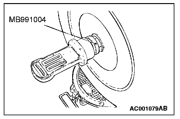 NOTE: Attach the camber/caster/kingpin gauge to the driveshaft by using special tool MB991004. Tighten special tool MB991004 to the same torque 196 - 255 Nm (145 - 188 ft-lb) as the drive shaft nut.