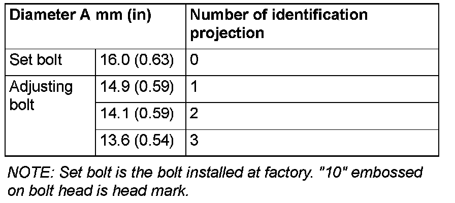 1. Estimate how much additional camber adjustment is required. Using the table below, select the camber adjusting bolt, and then replace the knuckle and strut assembly connection bolts (upper bolt, lower bolt) with the selected bolts.