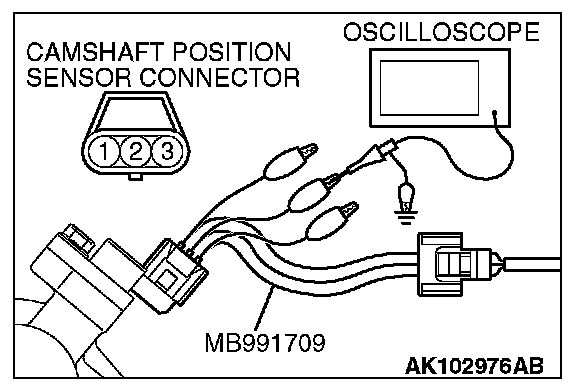 1. Disconnect the camshaft position sensor connector, and connect the test harness special tool (MB991709) between the separated connector (All terminals should be connected).