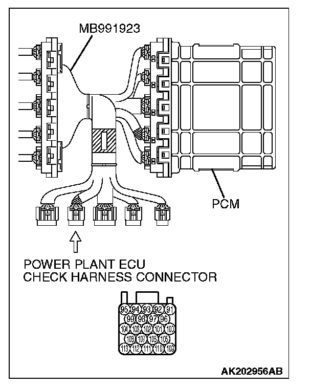1. Disconnect all PCM connectors. Connect the check harness special tool (MB991923) between the separated connectors.