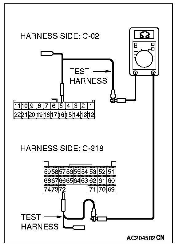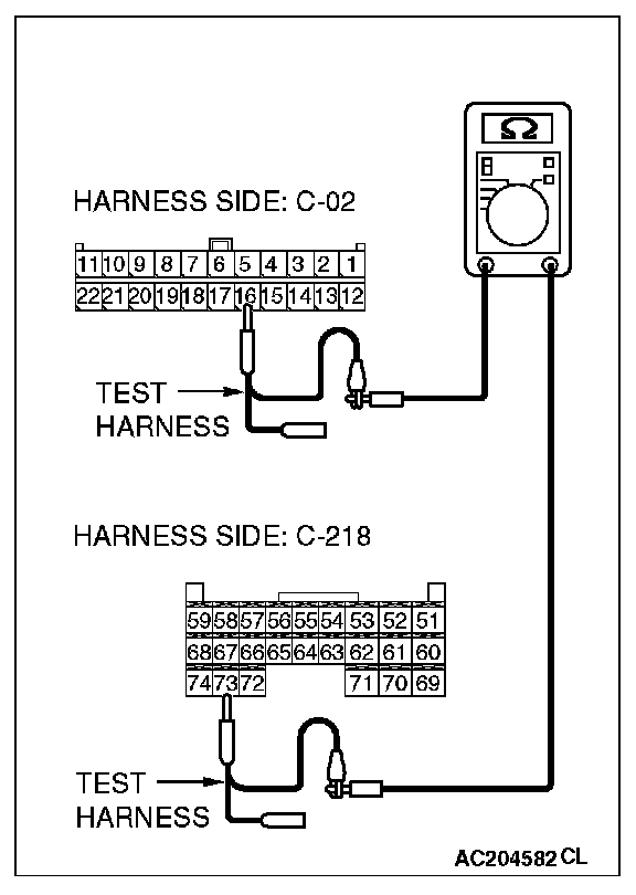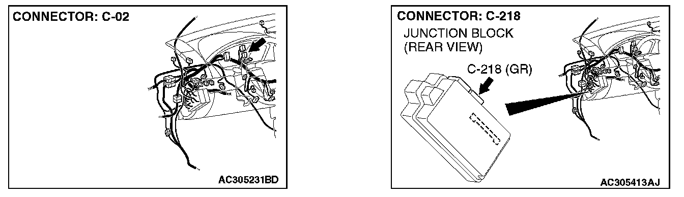 1. Disconnect joint connector (3) C-02 and ETACS-ECU connector C-218, and measure the resistances at the wiring harness sides of joint connector (3) C-02 and ETACS-ECU connector C-218.