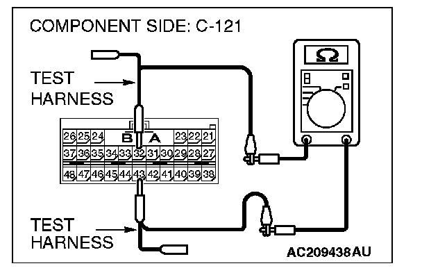 1. Disconnect SRS-ECU connector C-121, and measure the resistance at the component side of SRS-ECU connector C-121.