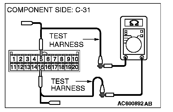 1. Disconnect multi-center display unit connector C-31 [Mitsubishi Multi Communication System], and measure the resistance at the component side of multi-center display unit connector C-31 [Mitsubishi Multi Communication System ].