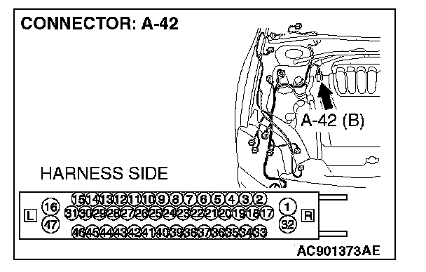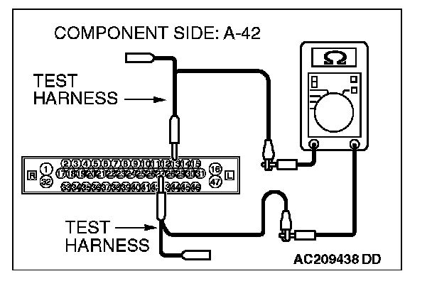 1. Disconnect TCL/ASC-ECU connector A-42, and measure the resistance at the component side of TCL/ASC-ECU connector A-42.