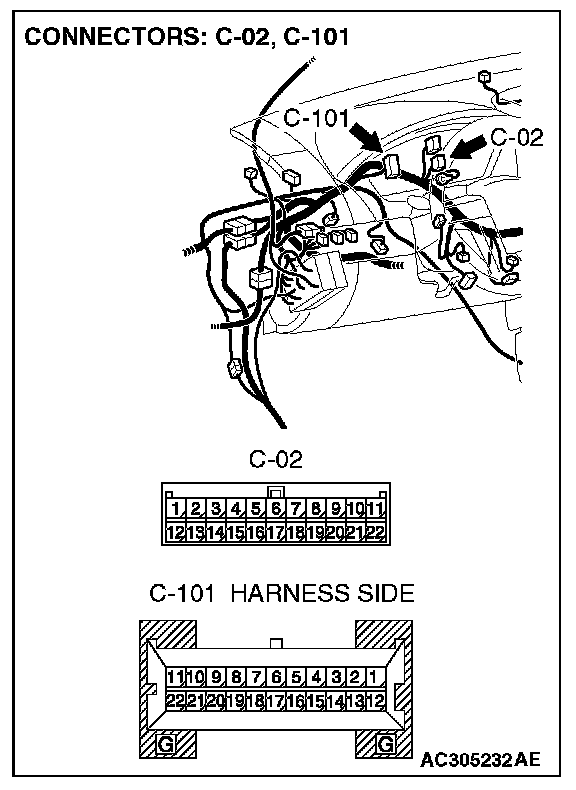 STEP 3. Check joint connector (3) C-02 and combination meter connector C-101 for loose, corroded or damaged terminals, or terminals pushed back in the connector.