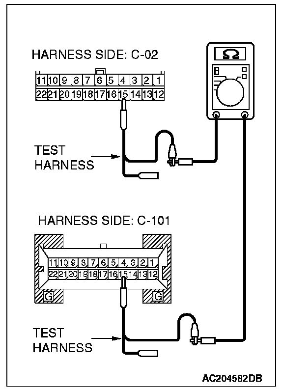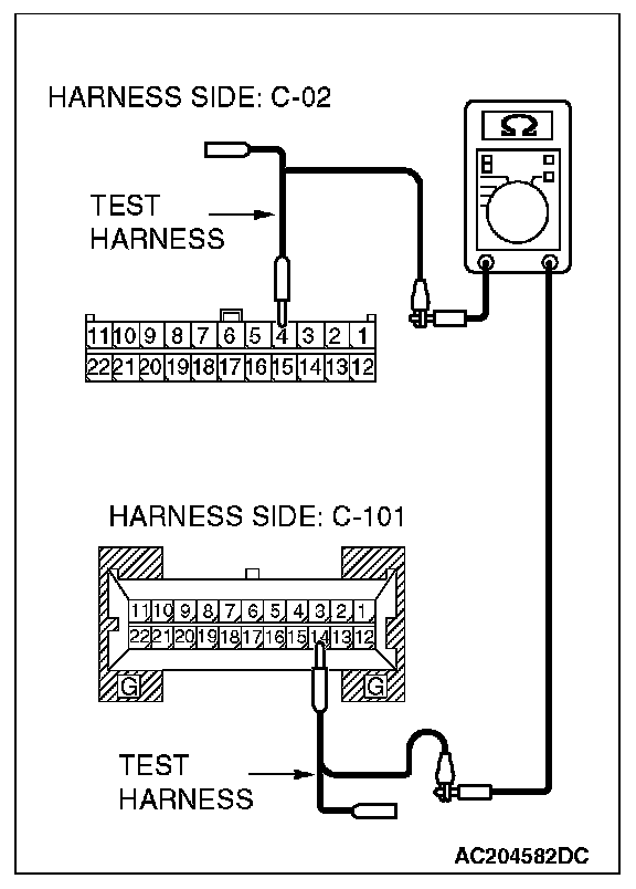 1. Disconnect joint connector (3) C-02 and combination meter connector C-101, and measure the resistance between each wiring harness side connector.