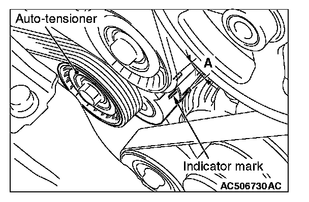 2. Make sure that the indicator mark on the auto-tensioner is within the area marked with A in the illustration.