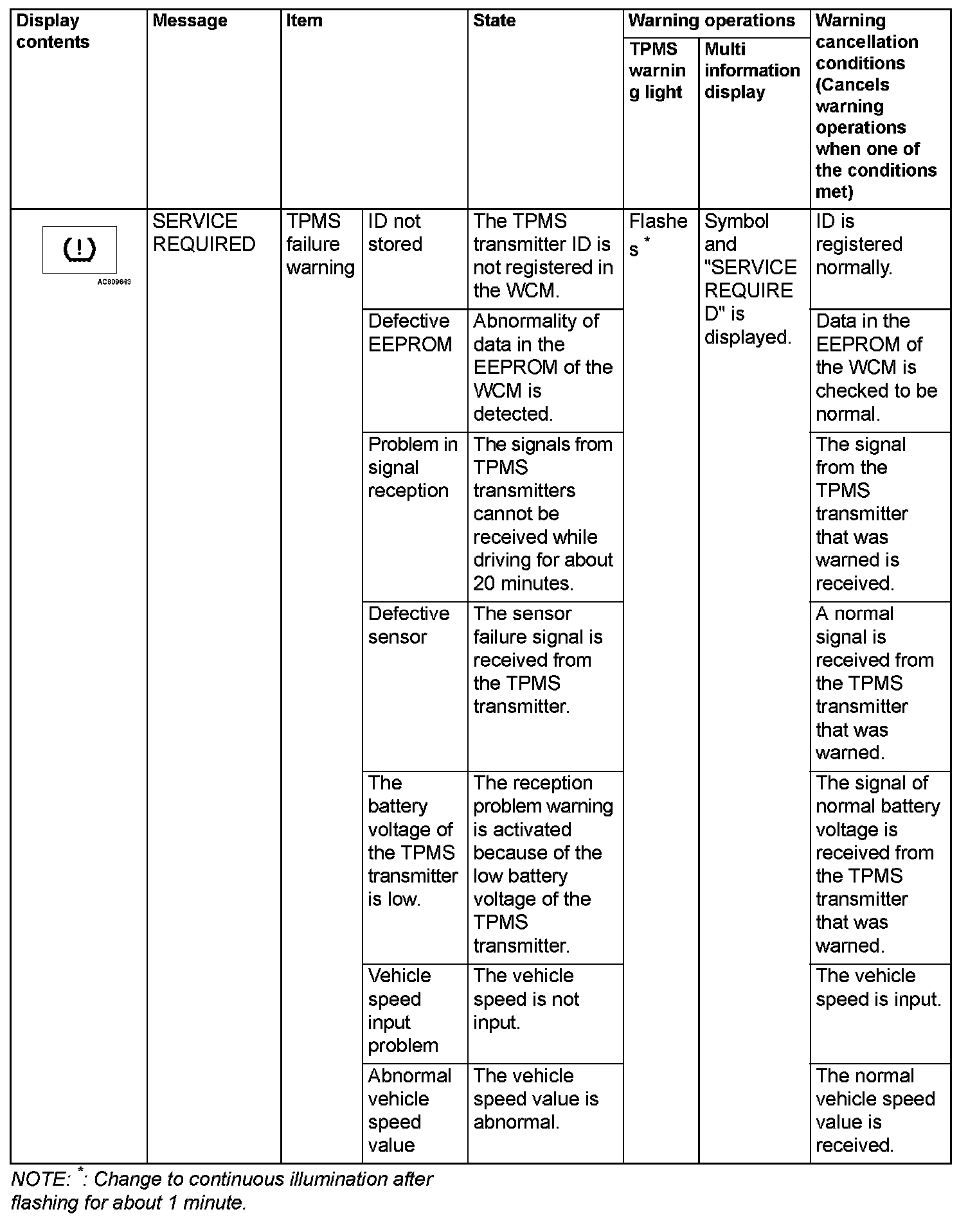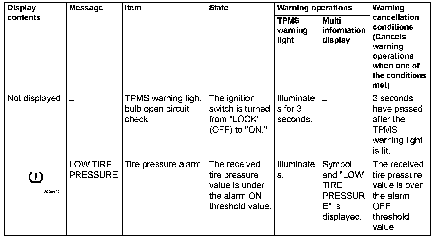 If the TPMS fails or the tire pressure is low, the WCM warns the driver of that state by the TPMS warning light and the multi information display in the combination meter.