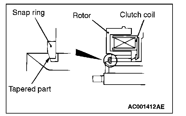 Using snap ring pliers, fit the snap ring so that the snap ring's tapered part is on the outside.