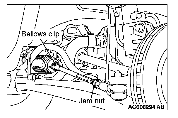 1. Adjust the toe-in by undoing the bellows clip and jam nut, and turning the left and right tie rod turnbuckles by the same amount (in opposite directions).