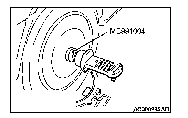 NOTE: For vehicles with aluminum type wheels, attach the camber/caster/kingpin gauge to the driveshaft by using the special tool MB991004. Tighten the special tool MB991004 to the same torque 144 - 176 Nm (106 - 130 ft-lb) as the driveshaft nut.