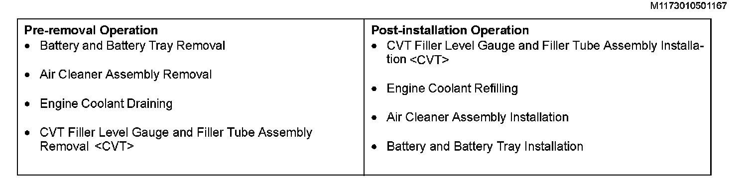 REMOVAL AND INSTALLATION [2.0L ENGINE NON-TURBO (VEHICLES FOR CALIFORNIA), 2.4L ENGINE]Pre-removal & Post-installation Operation: