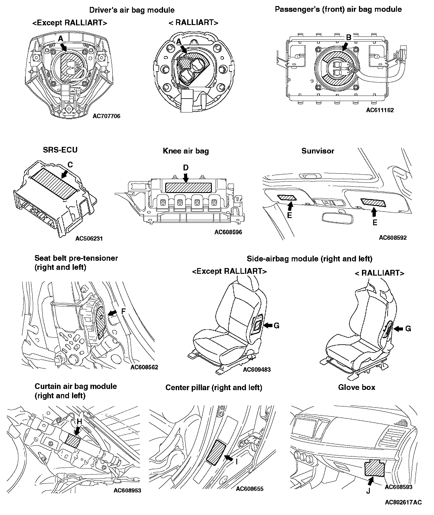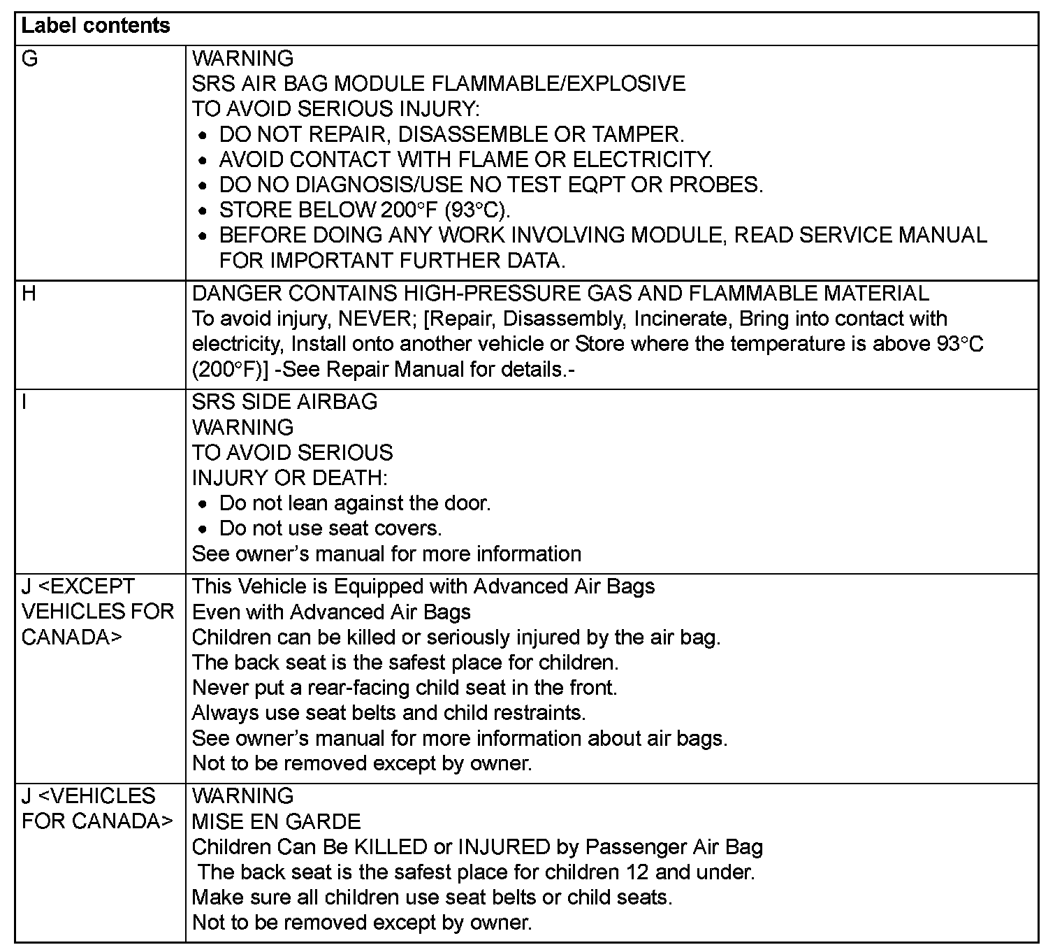 WARNING/CAUTION LABELSA number of caution labels related to the SRS are found in the vehicle, as shown in the following illustrations. Follow label instructions when servicing SRS. The label I is not to be removed except by owner. If the other labels are dirty or damaged, replace them.