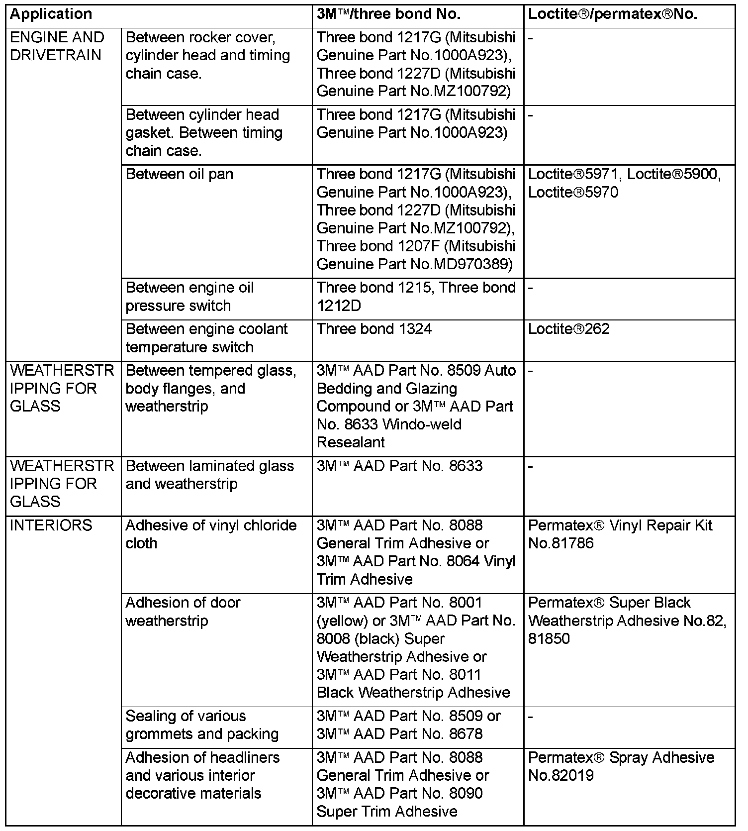 Main Sealant and Adhesive Table