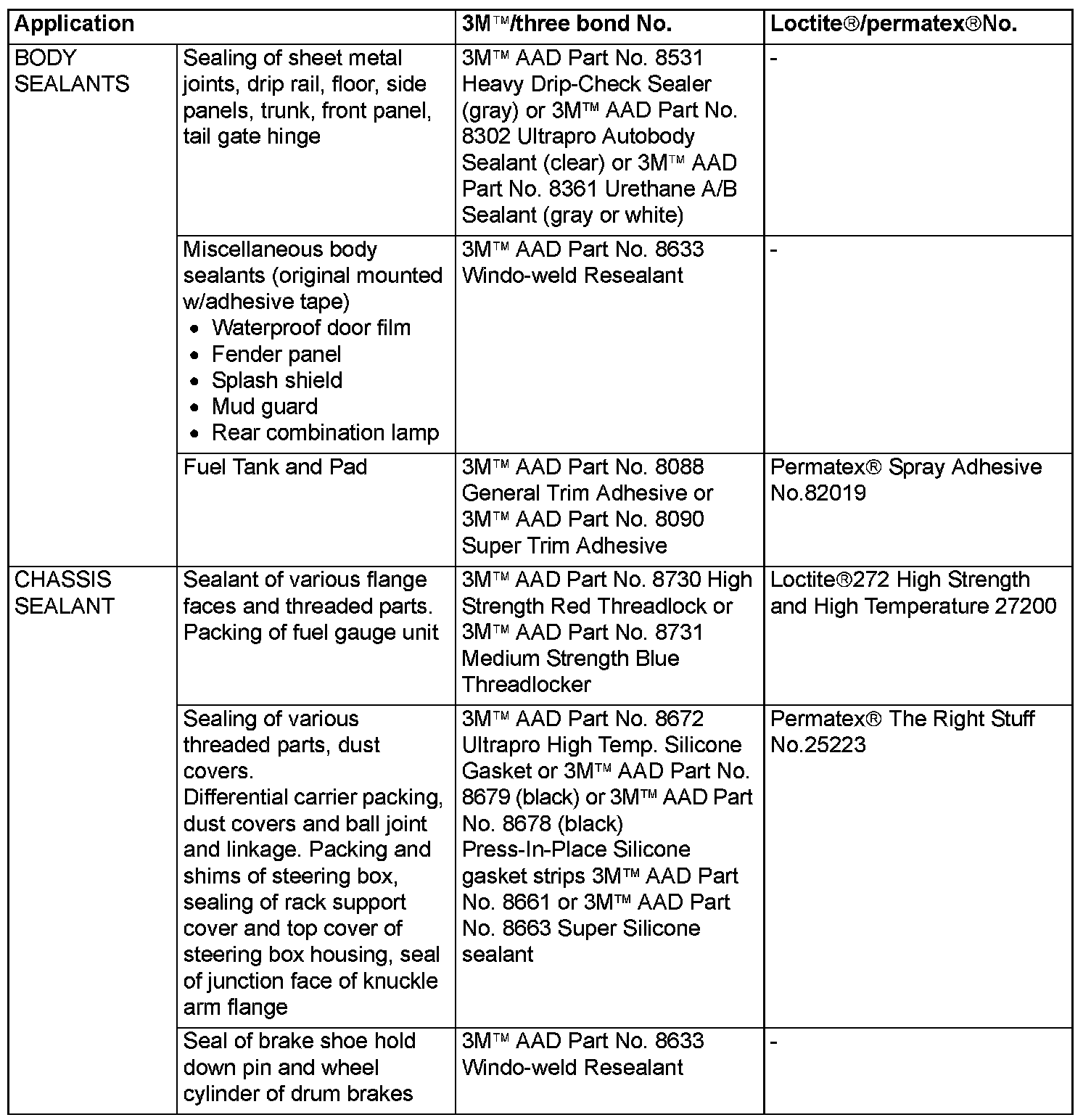 MAIN SEALANT AND ADHESIVE TABLE
