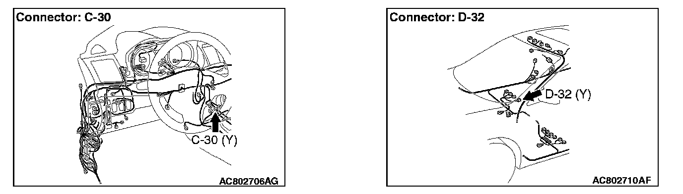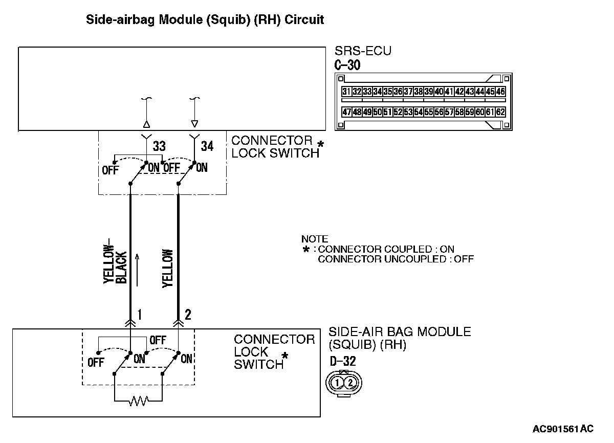 - SRS-ECU connector C-30 (terminal No.33) and the side-airbag module (RH) connector D-32 (terminal No.1)
