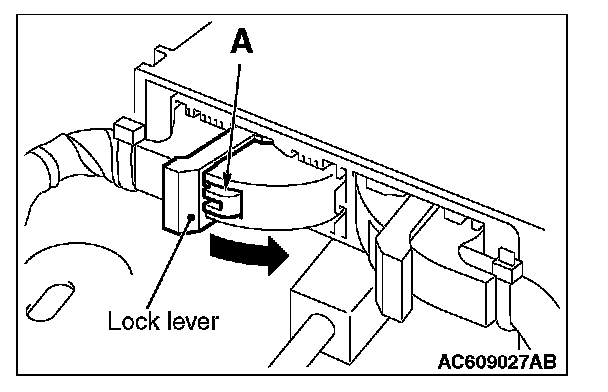 2. While pushing the part "A" indicated in the figure of the harness side connector, turn the lock lever to the direction of the arrow to release the lock lever, and disconnect the C-30 SRS-ECU connector.