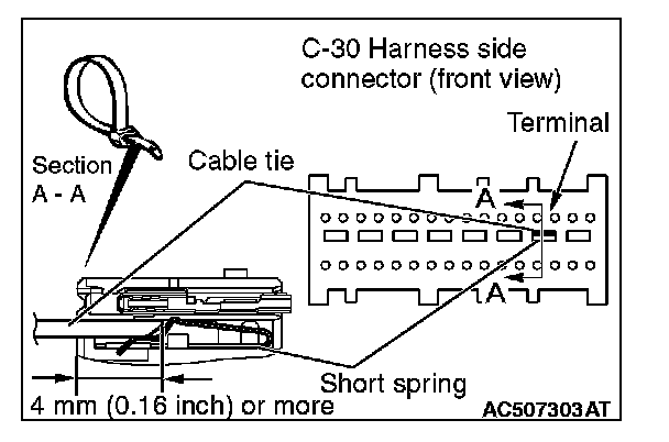 4. Insert a cable tie [3 mm (0.12 inch) wide, 0.5 mm (0.02 inch) thick] between terminals 33, 34 and the short spring to release the short spring.