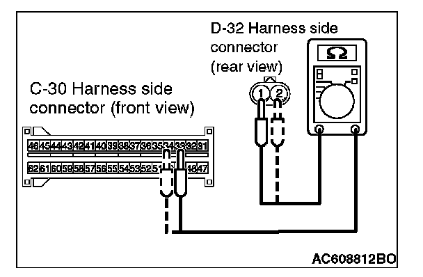 STEP 4. Check the harness for open circuit between SRS-ECU connector C-30 (terminal No.33 and 34) and the side-airbag module (RH) connector D-32 (terminal No.1 and 2).