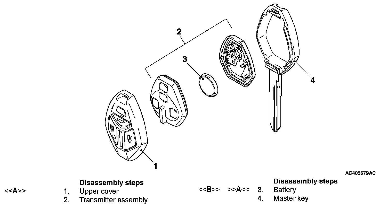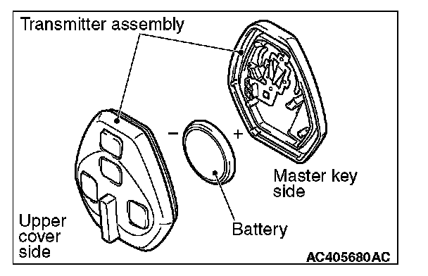 Install a new battery to the transmitter assembly with its (+) side facing towards the master key side.