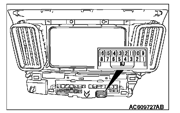 2. Connect the battery (+) terminal with the center panel connector (terminal No. 15). Then, check if the theft-alarm indicator is illuminated when the battery (-) terminal and the center panel connector (terminal No. 12) are connected.