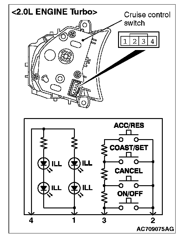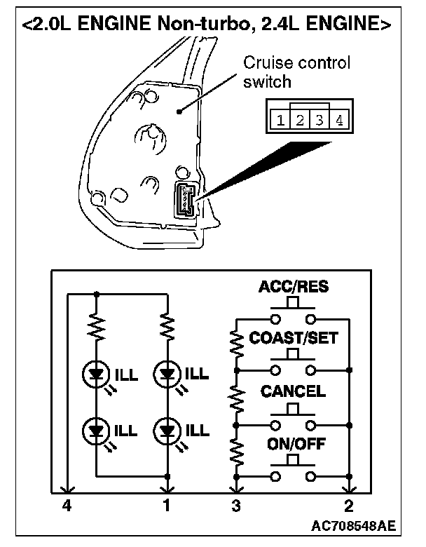 3. Check that the cruise control switch illuminates when a positive battery terminal is connected to the connector terminal number 4, and terminal number 1 is grounded.