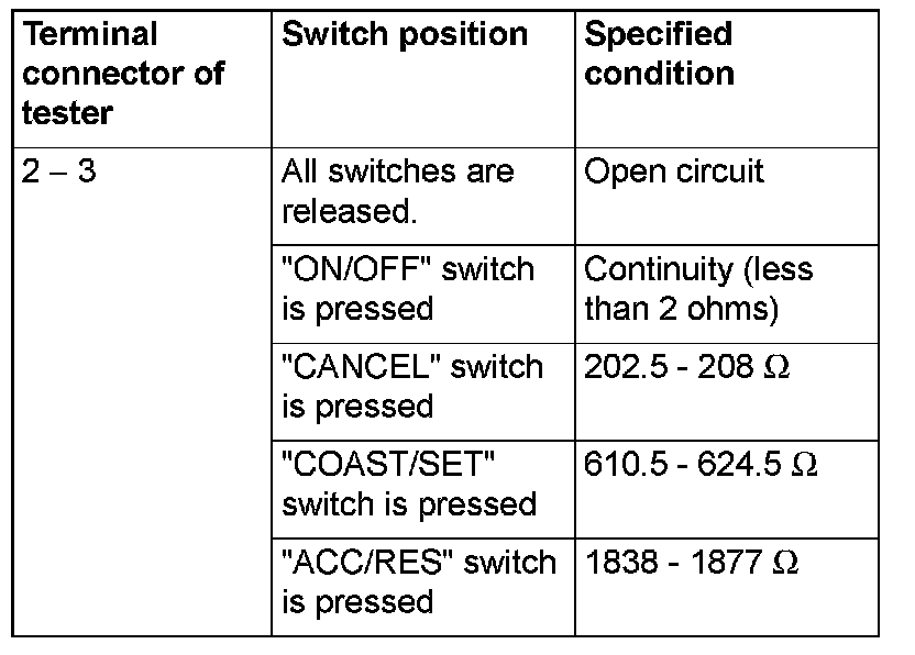2. Measure the resistance between terminal number 2 and terminal number 3 when each of the "ON/OFF", "CANCEL", "COAST/SET" and "ACC/RES" switches is pressed. If the values measured at the time each switch is pressed correspond to those in the table below, the resistance values are correct.