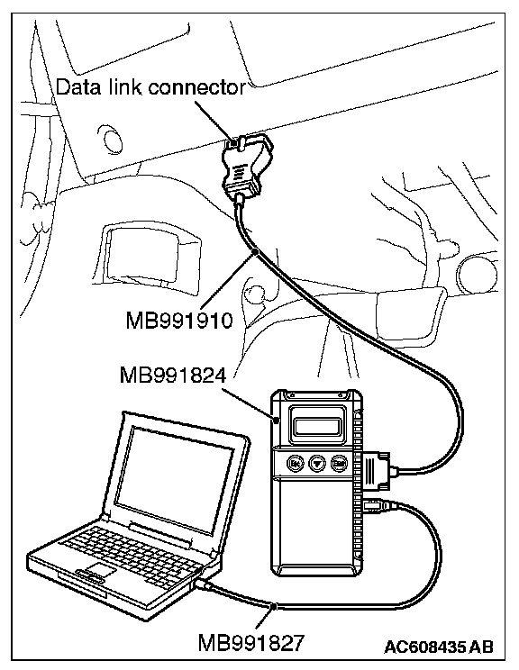 1. Connect scan tool MB991958. Refer to "How to connect the Scan Tool (M.U.T.-III)." How to Connect the Scan Tool (M.U.T.-III)