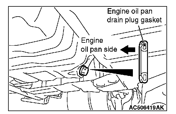 4. Install a new engine oil pan drain plug gasket so that it faces in the direction shown in the illustration, and then tighten the engine oil pan drain plug to the specified torque.