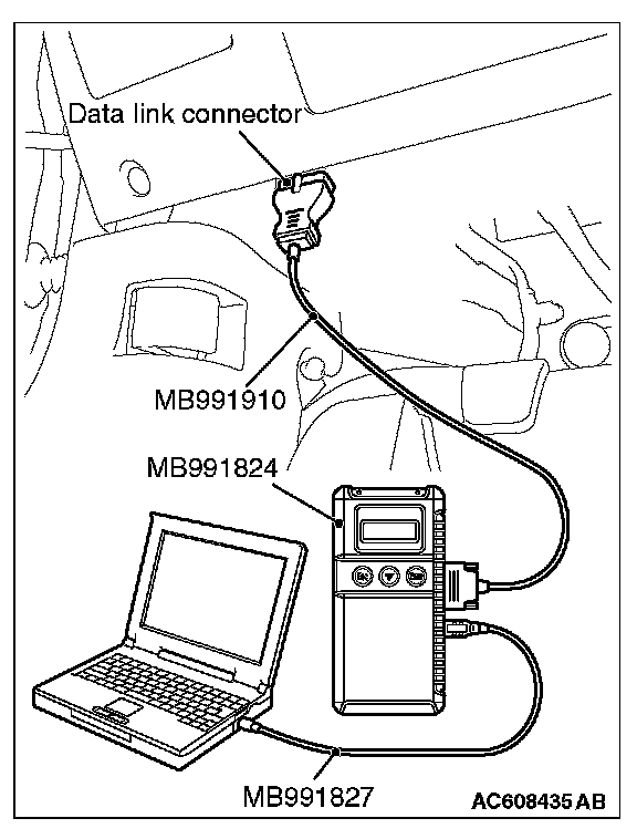 CAUTION: To prevent damage to scan tool MB991958, always turn the ignition switch to the "LOCK" (OFF) position before connecting or disconnecting scan tool MB991958.
