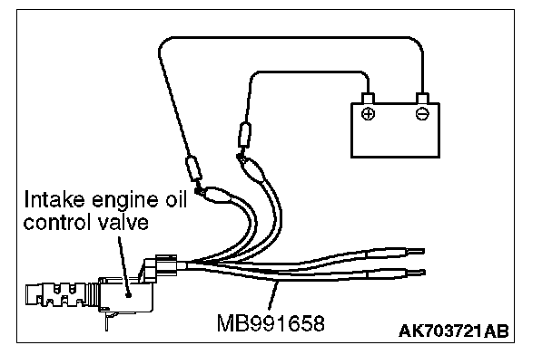 2. Check that the operation sound of the intake engine oil control valve can be heard when the positive battery voltage is supplied to the intake engine oil control valve. (Use the special tool MB991658 to connect terminal No. 2 of the intake engine oil control valve connector to the positive battery terminal and terminal No. 1 to the negative battery terminal.)
