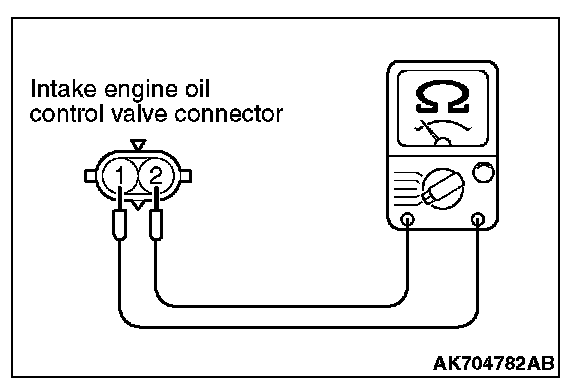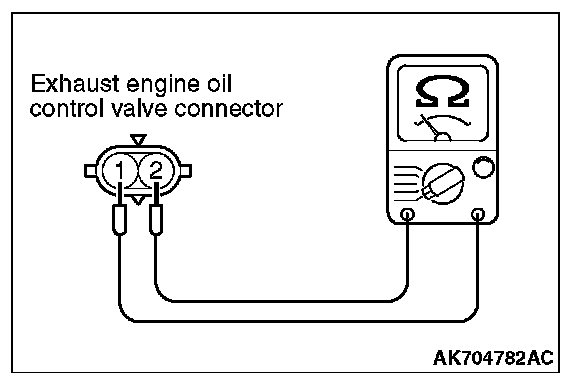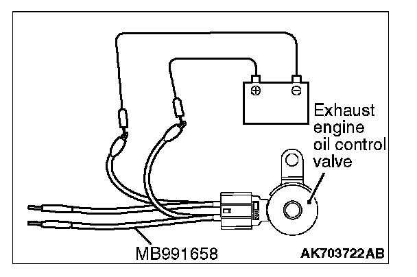 2. Check that the operation sound of the exhaust engine oil control valve can be heard when the positive battery voltage is supplied to the exhaust engine oil control valve. (Use the special tool MB991658 to connect terminal No. 2 of the exhaust engine oil control valve connector to the positive battery terminal and terminal No. 1 to the negative battery terminal.)